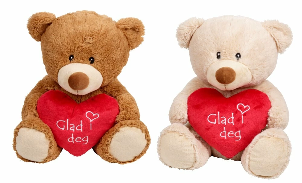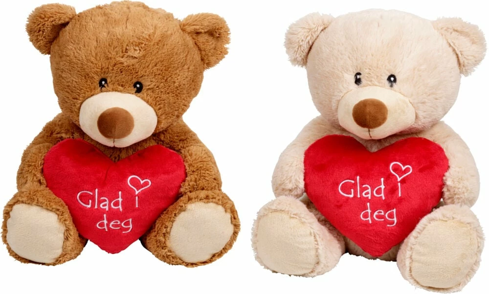Søt kosebamse med hjerte i hendene. Perfekt bursdags -eller valentines gave til en du er glad i. 30 cm. I assorterte farger og variabel tekst på hjertet. Ikke egnet for de under 3 år.