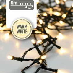 Lysslynge med 80 LED-lys i varmhvitt lys. Dette er en IP44 sertifisert lysslynge. Ledningen er mørkegrønn og er 3 meter lang fra stikkontakt til LED-lysene starter. Det er ca. 7,5 cm mellom hvert LED-lys og hvert LED-lys er ca. 5 mm. LED-lysene sitter på en 6 meter slynge = total lengde er 9 meter. Strømdrevet. 220-240V.