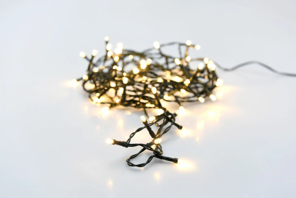 Lysslynge med LED-lys i varmhvitt lys. Ledningen er mørkegrønn og er 3 meter lang fra stikkontakt til LED-lysene starter.