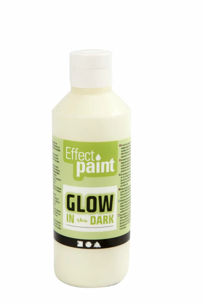 Glow in the dark – selvlysende maling, som lyser når lyset slukkes. Egnet til lyse flater. Jo flere lag – jo større effekt.
