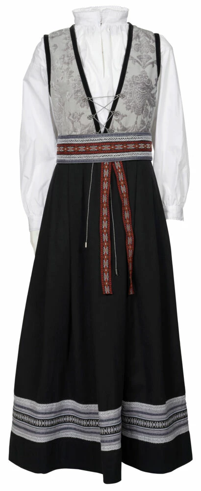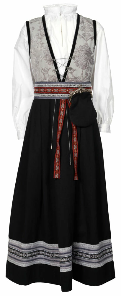 Festdrakt i ekstra god kvalitet, med nydelig jaquard vevet liv og kantebånd nederst. Pene vevede pyntebånd med mønster på skjørt og på beltet. Beltet har nydelig kantebånd i fløyel, og festes bak med hekter. Det er mange hekter på beltet, så det kan justeres etter livstørrelse. Nydelig kantebånd i fløyel rundt ermåpning og halsåpningen. Tinnfargede hekter foran. Sølvfarget snor som er festet til hektene for å justere åpningen på liv/byste. Bluse i god kvalitet, med lekre detaljer. Modellen har en fin passform og er romslig i størrelsen. Det medfølger en festdrakt-veske, vesken er i samme ullstoff som drakten. Veskelås i sølvfarge og hank i sølvfarget metallkjede.