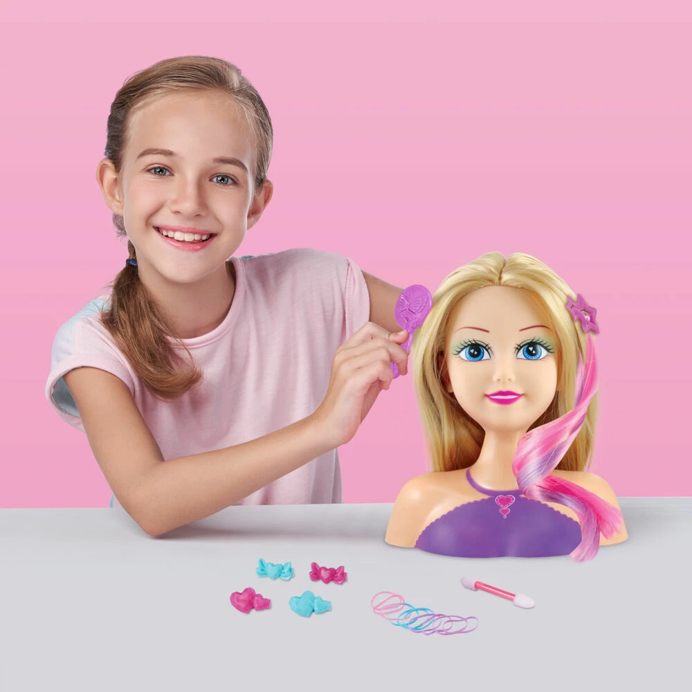 Stylinghode à 20 deler: Dukken har langt fint hår du kan style med medfølgende assessoirer,- inkl hair-extensions, børste, hårspenner, hårstrikker m.m