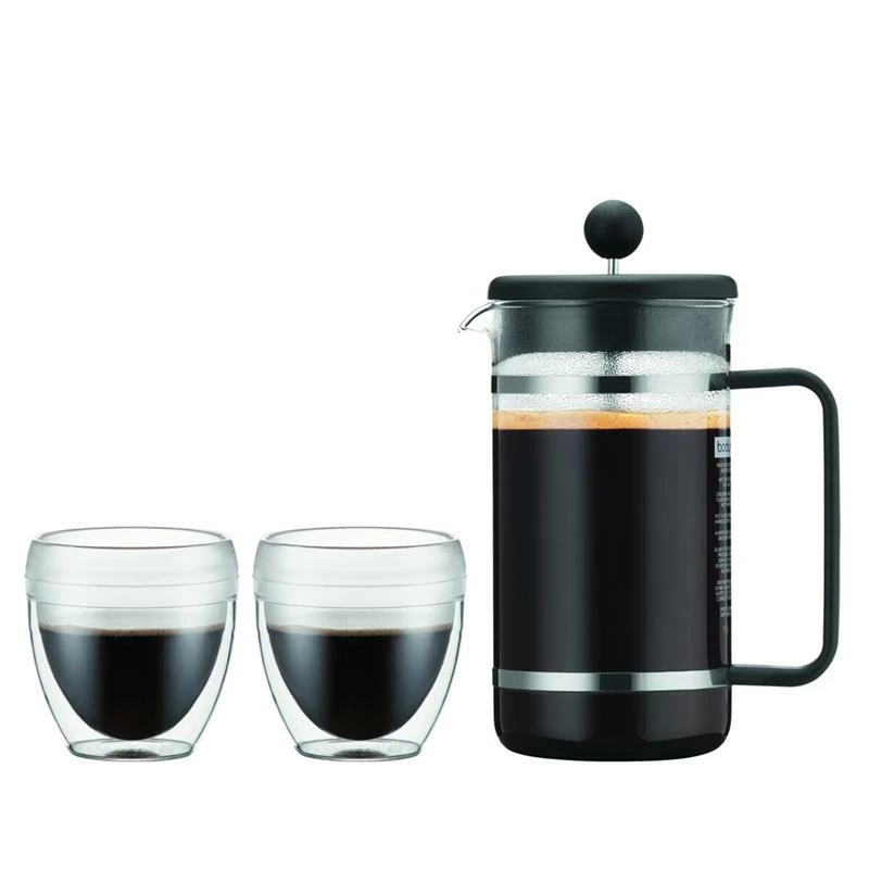 Bistro presskanne med 1 liter kapasitet i rustfritt stål og plast, og 2 stk PAVINA® OUTDOOR kaffekopper; 2 stk 2,5 dl kopper i uknuselig, sterk plast, som tåler det meste. Perfekt for å ta kaffekoppen med deg (istedetfor å bruke engangspapp-krus,- slik skåner du også miljøet!). Hele settet kan vaskes i oppvaskmaskinen.