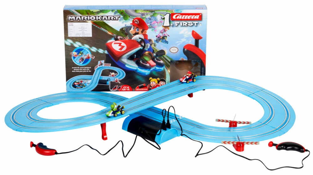 Carrera FIRST Nintendo Mario Kart bilbane er for de yngre bilkjørere! Enkelt utformet bane, og 2 enkle kontrollere. Settet kommer med en Mario-bil og en Yoshi-bil. Begge inspirert av det legendariske Nintendo spillet Mariokart. Bilbanen måler 2,4 meter og den byr på utfordrende svinger og spinnere som lager ekstra spenning under racet.
