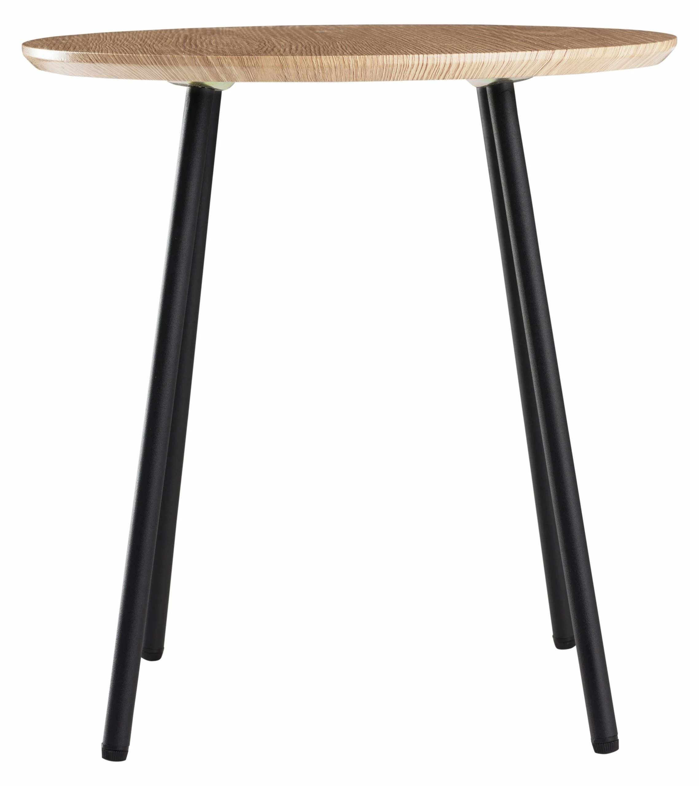 Day bord, Ø 40 cm. Med sorte metallben og MDF bordplate. Platen er MDF med PVC folie tre mønstret, 15 mm.