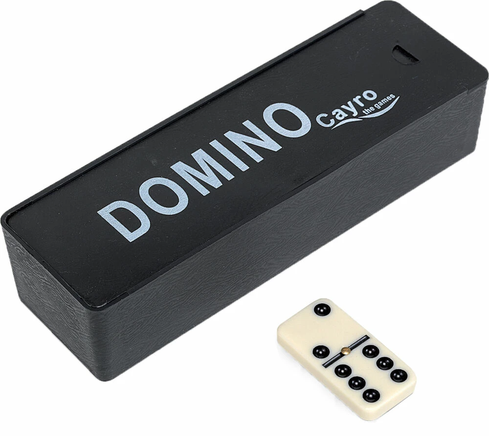 Klassisk Domino spill. 28 brikker og opptil 6 prikker på hvert felt. For 1 eller flere spillere. Fra 5 år og oppover. Format: H:5,5 B:18,0 D:4,0 cm