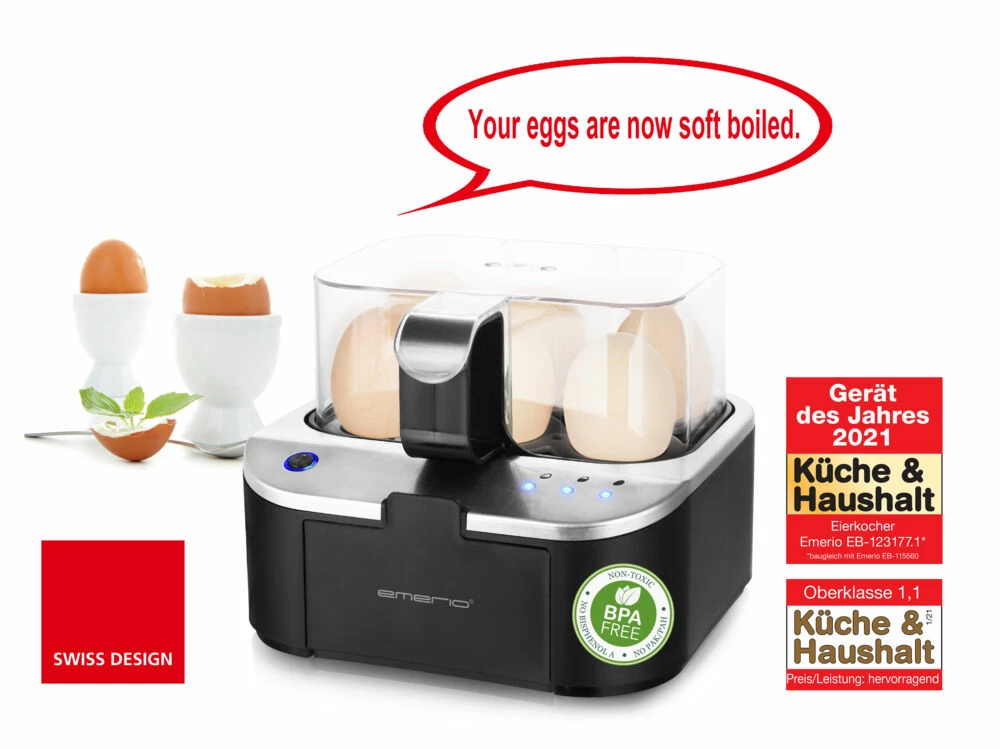 Den «snakkende eggekokeren» – sier fra til deg med en stemme, et lyd- og lyssignal når eggene dine er kokt nøyaktig slik du vil ha dem!
