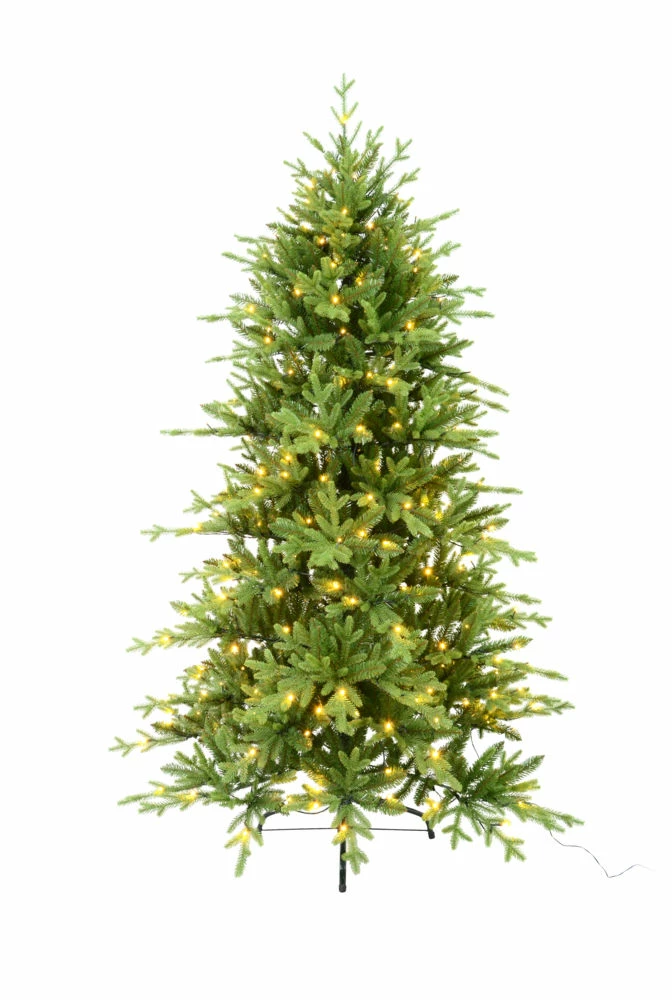 Et ekstra smalt tre med 240 varmhvite LED-lys ferdig montert på treet. Med 5-stegs dimmer på transformator. Høyde 210 cm. Diameter 117 cm.