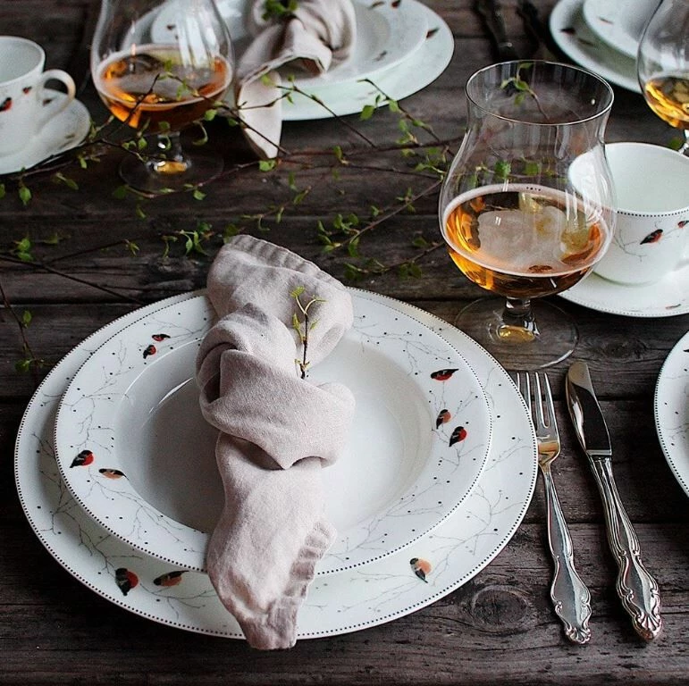 Det nye serviset Dompap er utviklet med den norske vinteren i tankene. Hva er vel koseligere enn en liten, lubben, rød fugl på en rimfrostet gren? Den fargesterke dompapen er et kjærkomment syn i det hvite vinterlandskapet. Fuglens rødfarge synes godt på en bakgrunn inspirert av kalde klare dager, blekt dempet vinterlys og bare grener. Dompap er et servise laget av elegant benporselen med små detaljer i ekte platina.