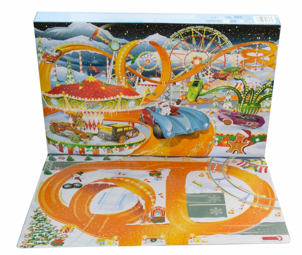 Bak hver av de 24 dørene er en overraskelse med juletema for lekebilentusiaster. Settet inneholder åtte Hot Wheels®-biler i skala 1:64 og 16 tilbehør som inspirerer til vinterlige eventyr. Selve boksen er en del av moroa med påsatt lekematte for bruk med de nye lekene. Kjøretøy og tilbehør fungerer kanskje ikke med alle Hot Wheels®-sett.