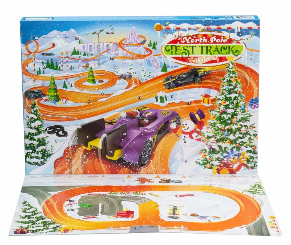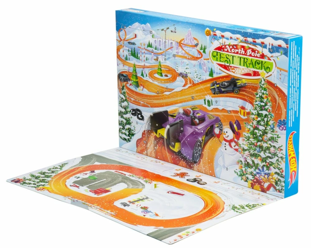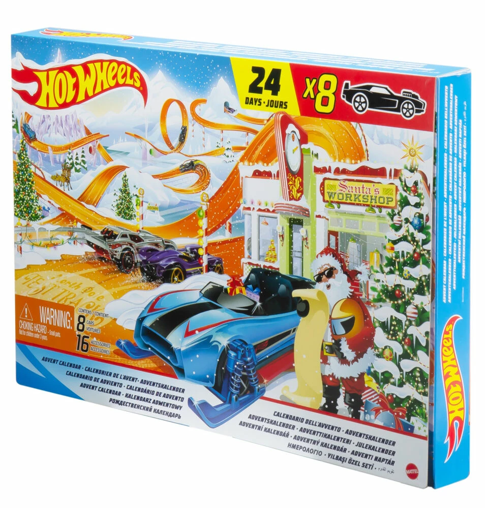 Hot Wheels® julekalender er den perfekte måten å få din Hot Wheels® -fan i julestemmning! Bak hver av de 24 lukene skjuler det seg en morsom overraskelse. Åpne èn luke hver dag og finn noe spennende,- kanskje èn av de 8 ulike 1:64- størrelse Hot Wheels® bilene, eller noe kult tilbehør. Kalenderens frontpanel kan åpnes og fungerer som en lekematte for dine nye leker. Kalenderen passer for barn fra 3 år. (Innholdet kan variere fra kalender til kalender).
