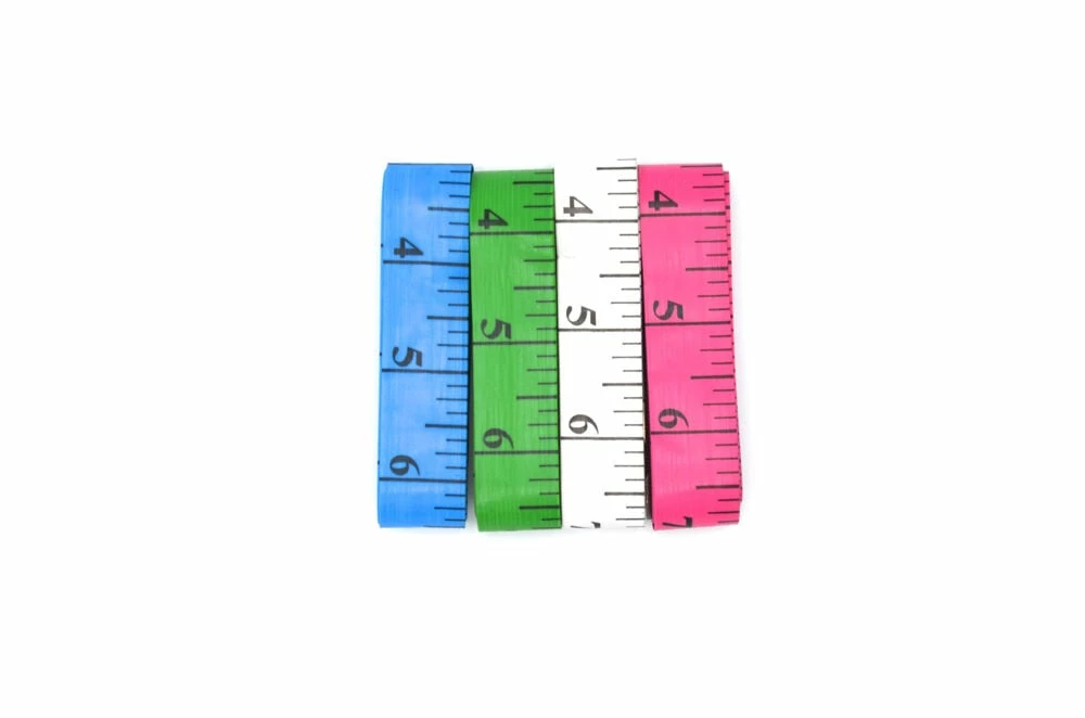 Målebånd i 5 forskjellige farger: Gul, rosa, blå, grønn og hvit. Viser cm på den ene siden og inches på den andre siden. Måler opp til 150 cm.
