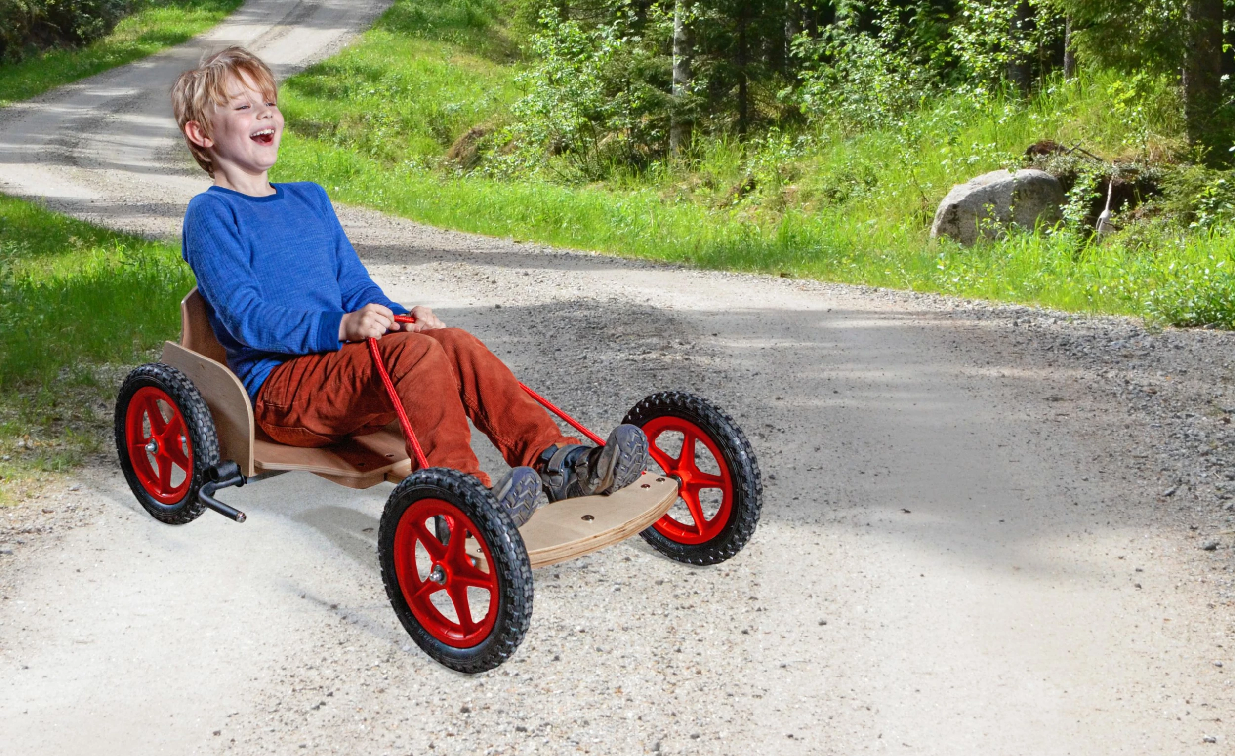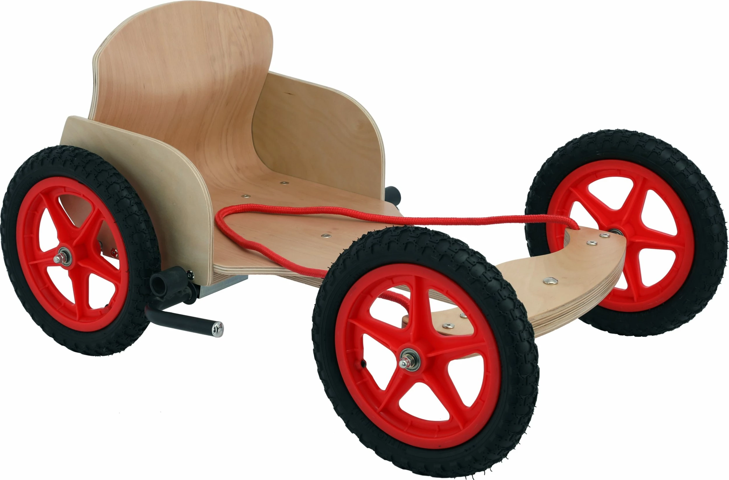 Olabil i kraftig tre, med helgummihjul på 12″. Olabilen leveres umontert, og bør monteres sammen med en voksen. Settet er enkelt å sette sammen! Skruer og verktøy for montering, medfølger. Olabilen måler 58 x 45 cm og kan benyttes av barn fra 5 år (under oppsyn av en voksen) og helt opp til en person på maks 80 kilo. Olabilen bør kun brukes under kontrollerte forhold, og bør benyttes med sikkerhetsutstyr (hjelm, albue- og knebeskyttere). Olabilen styres enkelt og manuelt ved hjelp av tauet som er montert ved framhjulene.