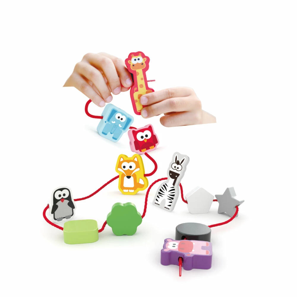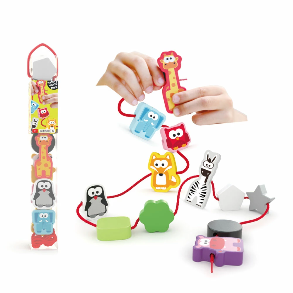 Produktnummer: 6943478016743 Kategorier: Leker, Treleker Stikkord: Jungelfigurer og klosser i tre, inkl rød trå for å træ figurene, Passer for barn 1-3 år