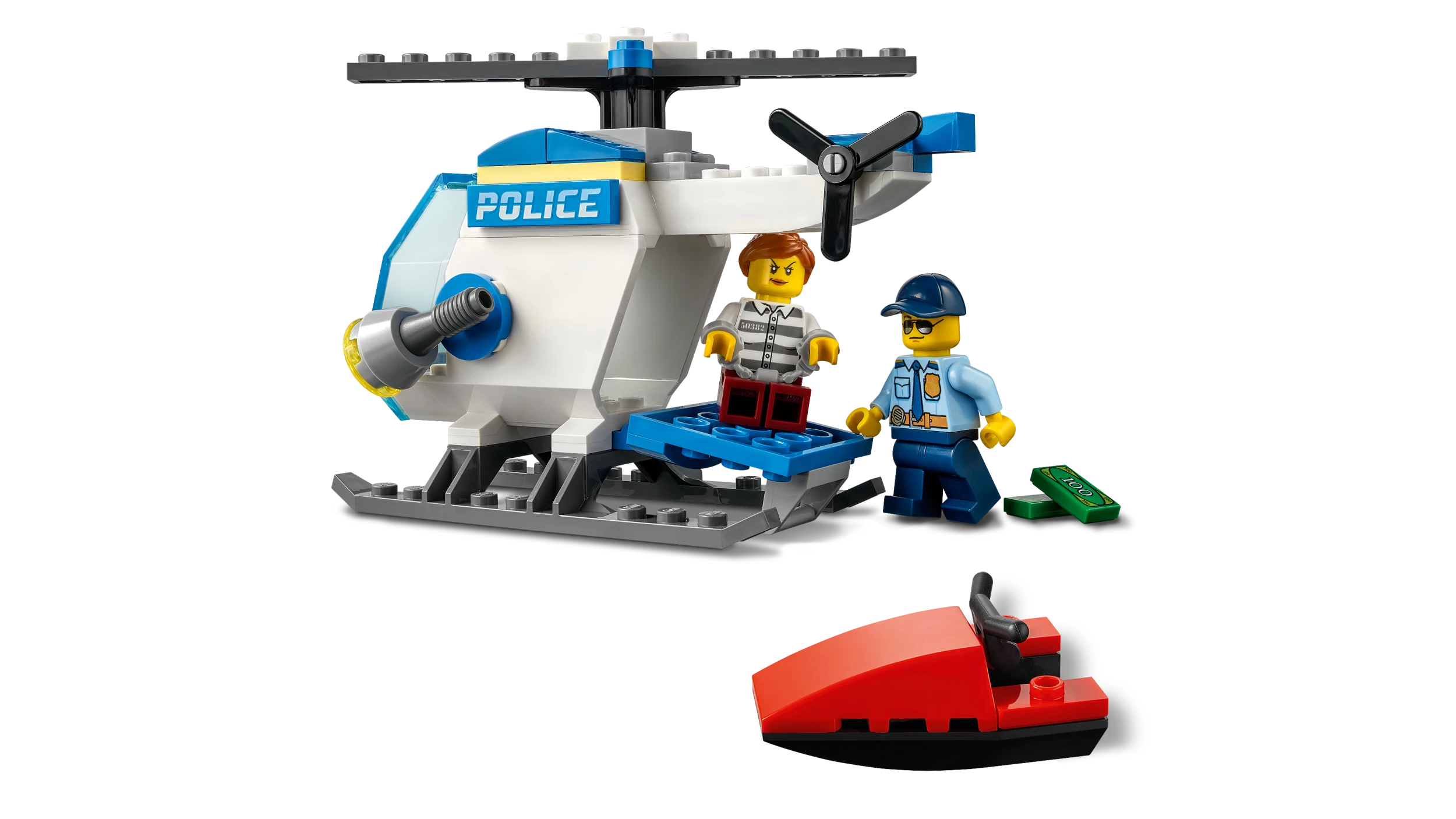 Gled en hverdagshelt med dette spennende LEGO® City lekesettet som inneholder et politihelikopter, skurkens vannscooter og to gøyale minifigurer.