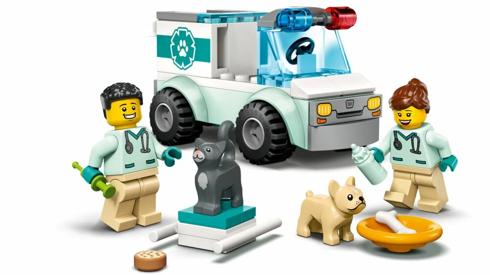 Bli med når dyrlegene kjører ut for å redde dyr. Pakk utstyret i det kule redningskjøretøyet, og dra av sted. Lær å mate den sultne katten med tåteflaske, og skjem bort hunden med et deilig kjøttbein. Bruk båren for å bære syke dyr, og gi dem medisin med sprøyten. Med LEGO® City settene kan barn dra på spennende dyreredningsoppdrag!