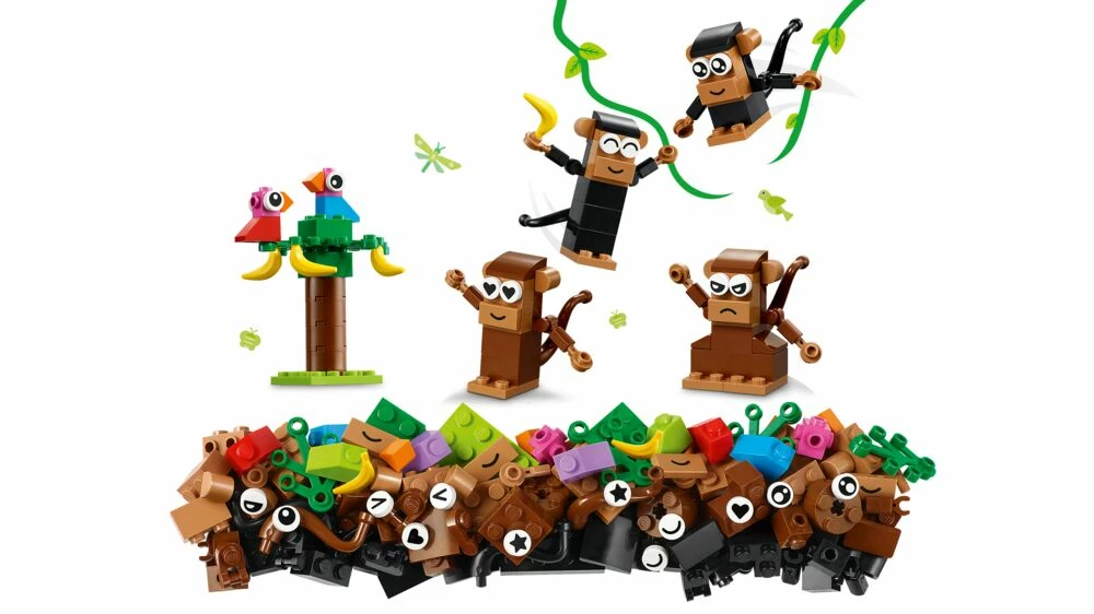 Barn bygge fire søte aper slik de vil, ved hjelp av et utvalg klosser, øyemotiver som er nye for 2023, og fliser med smilende og sur munn. Apene har justerbare armer med ledd, gripehender og roterbare gripehaler og kan finne på alle mulige slags sprell og rampestreker – de kan leie hverandre, henge fra et tre, stjele bananer eller erte fugler. Hele tiden mens de styrker barns finmotoriske og kreative ferdigheter. Settet inkluderer en trinnvis bildeveiledning, og i tillegg inneholder LEGO Builder appen en digital versjon av settets byggeinstruksjoner.
