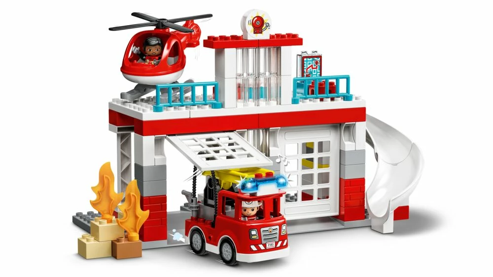 Det er hektisk aktivitet på brannstasjonen! Teamet rutsjer ned sklien, setter seg i Skyv og slipp-brannbilen og kjører ut av den store svingdøren med blinkende lys og påslått sirene. Et helikopter tar av fra taket og flyr til brannstedet. Når jobben er gjort, er det tid for trening og en velfortjent pizzapause før sengen kaller. I morgen blir det nok en travel dag.