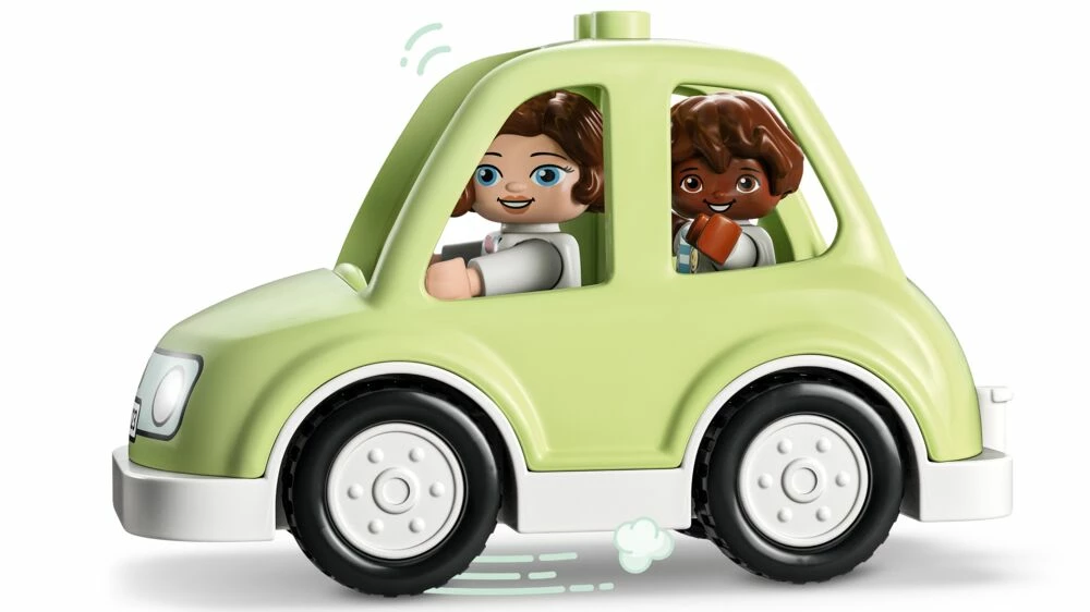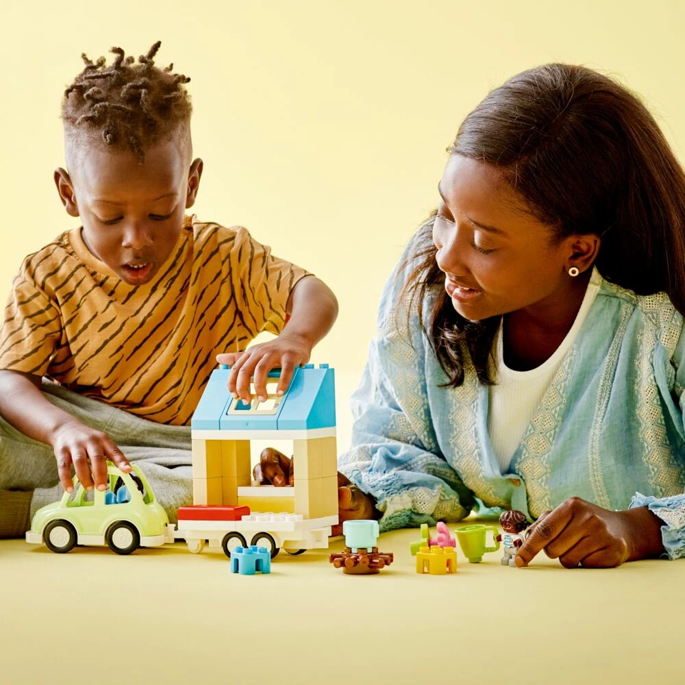 Med LEGO® DUPLO® Town Hus på hjul (10986) kan du dra på spennende reiser sammen med eventyrlystne barn. Hjelp smårollingen med å bygge det søte huset på hjul. Førskolebarn fra to år kan koblet huset på bilen og kjøre av sted på spennende eventyr. De bestemmer selv hvor de vil reise, og underveis kan de treffe mange nye og spennende mennesker!
