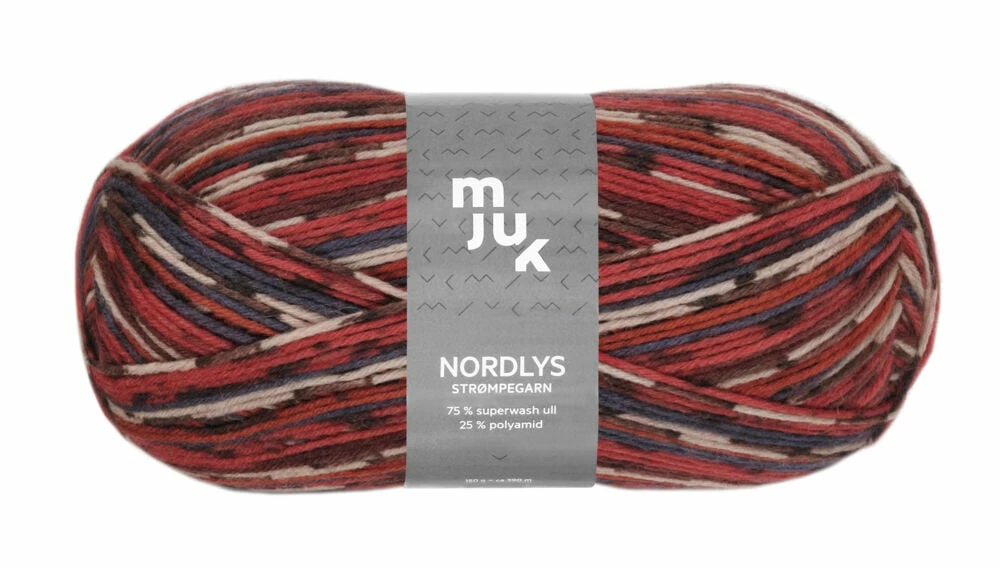 Mjuk Nordlys er et slitesterkt strømpegarn som består av 75% superwash ull og 25% polarmid. Garnet tåler maskinvask, 40 grader ullvugge. Garnet passer perfekt til sokker og strømper til hele familien. Oppskrift på bandarolens bakside. Nøstet er 150 gram og ca. 390 meter langt.