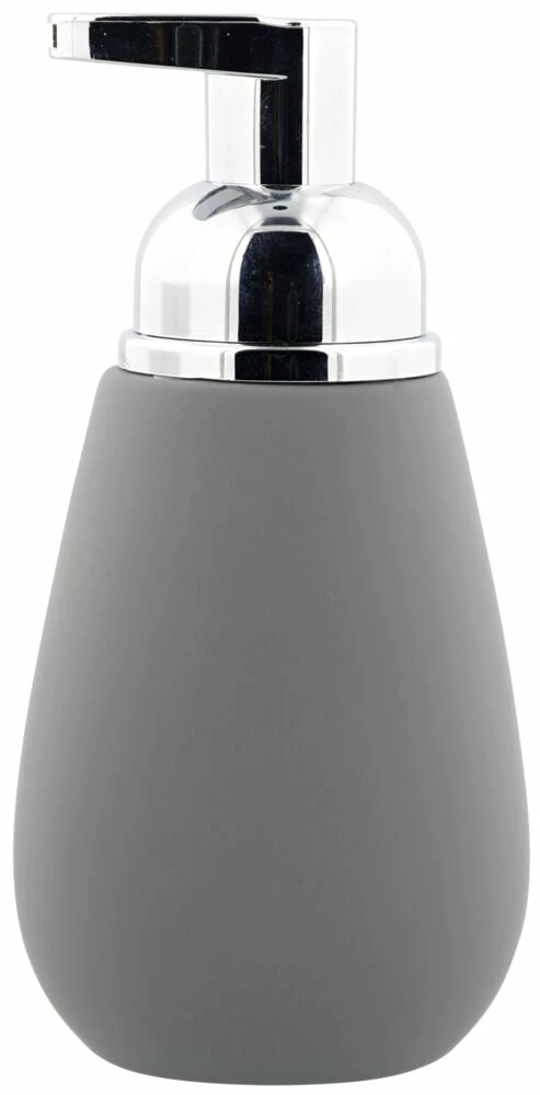Såpeskumdispenser i porselen med matt gummilakkering og plast med forkrommet lakkering.