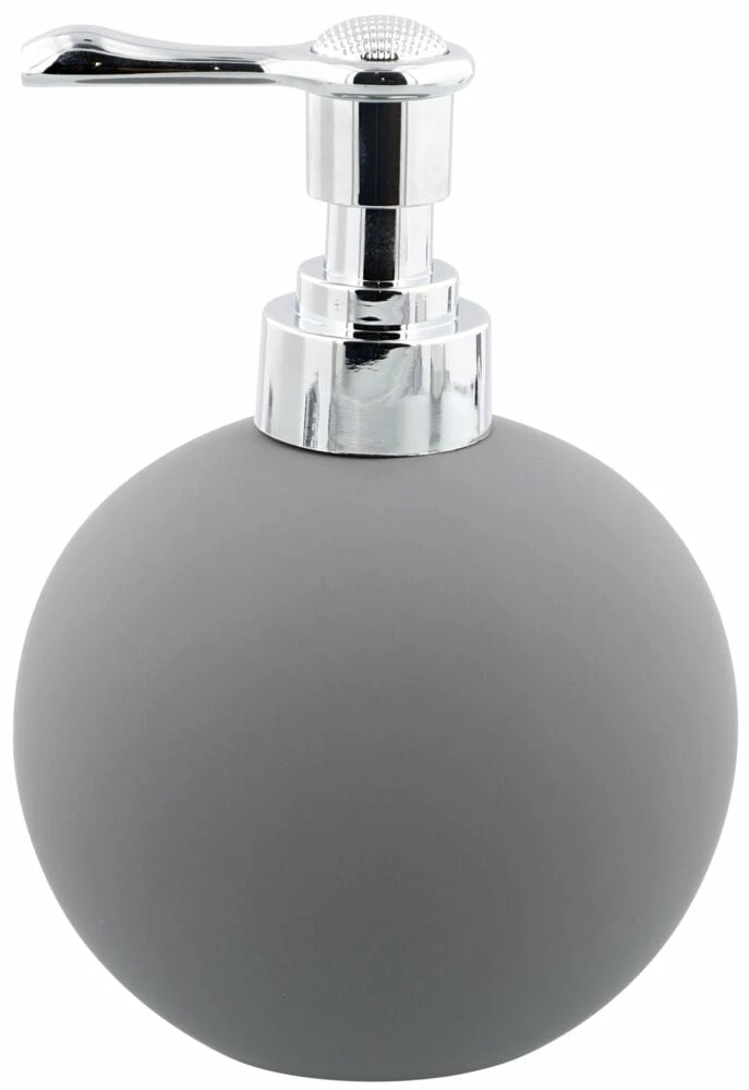 Såpedispenser i porselen med matt gummilakkering og plast med forkrommet lakkering.
