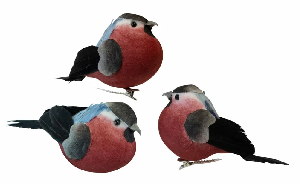 Dagnar dompap, dekorfugl med fjær til juletre. Sett av 3.