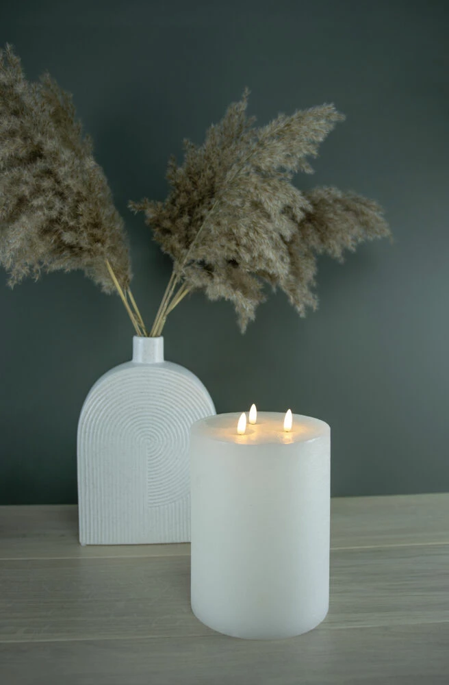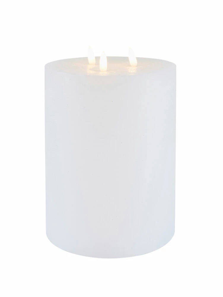 Stemningsfult hvitt kubbelys i stor størrelse med tre veker. Realistisk flamme med varmhvitt led-lys.
