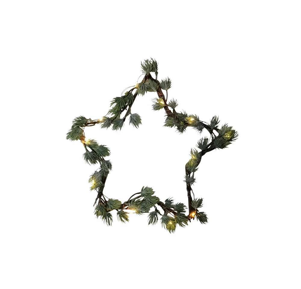 Praktfull dekorstjerne i grønt, 20 varmhvite LEDlys fordelt i krans. Størrelsen på krans i diameter er 30cm. Bruker 2xAA batterier, batterier er ikke inkludert. Timerfunksjon: 6/18