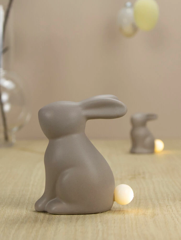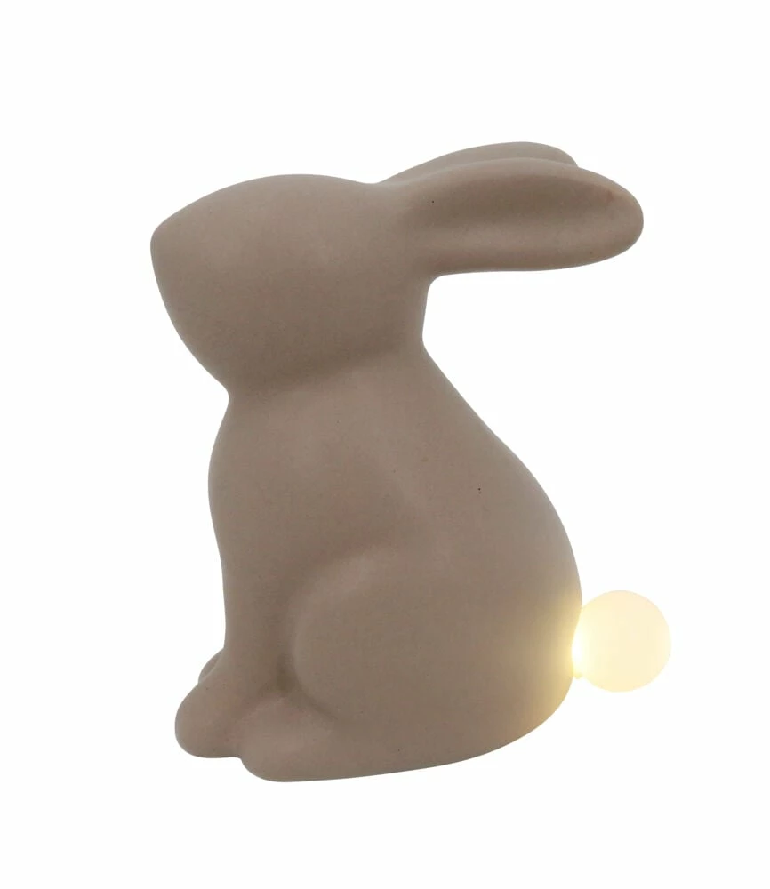 Brun eller hvit porselenskanin med LED-lys i halen. Høyde 11,5 cm