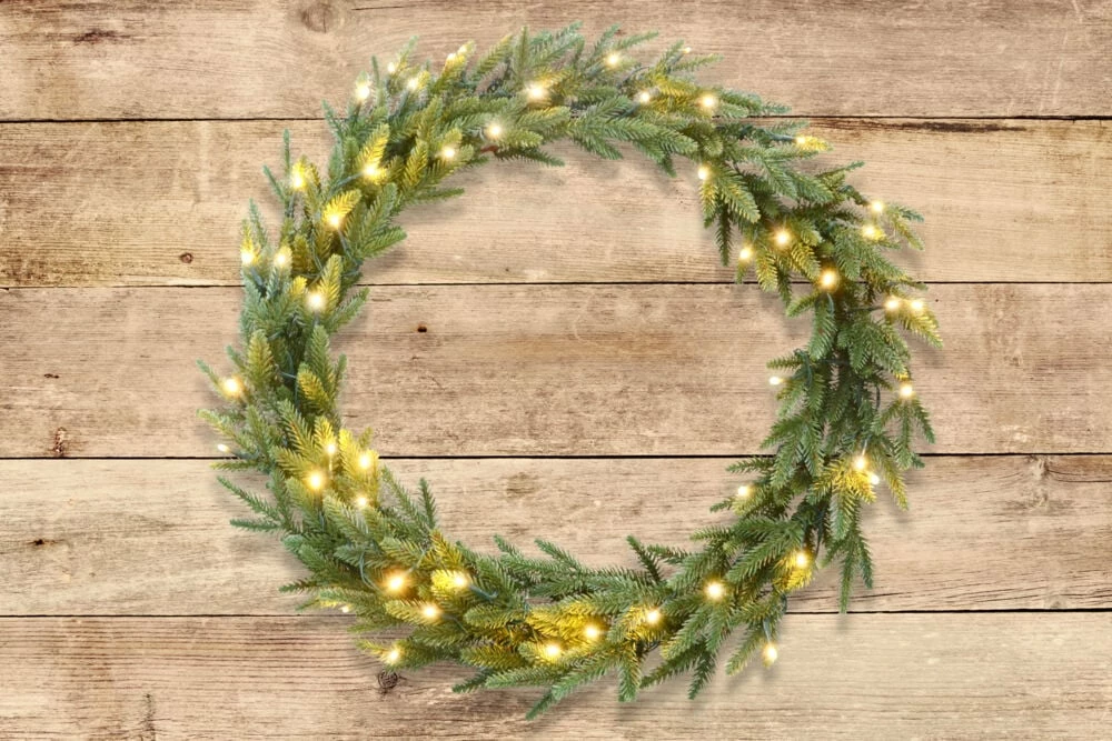 Stilig dekorkrans med 50 varmhvite LED-lys. Kransen passer perfekt på ytterdøren eller som pynt på veggen. IP44 klassifisert for inne- og utendørs bruk.
