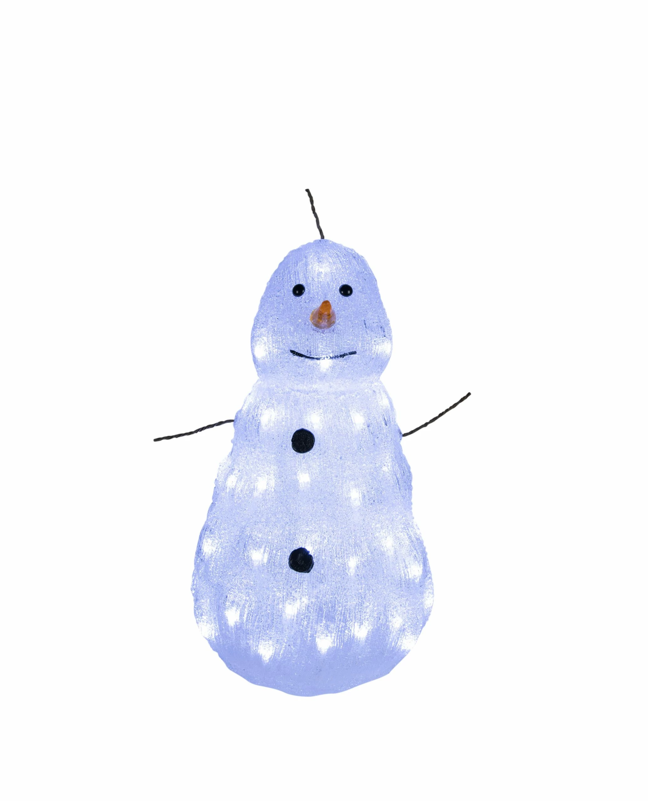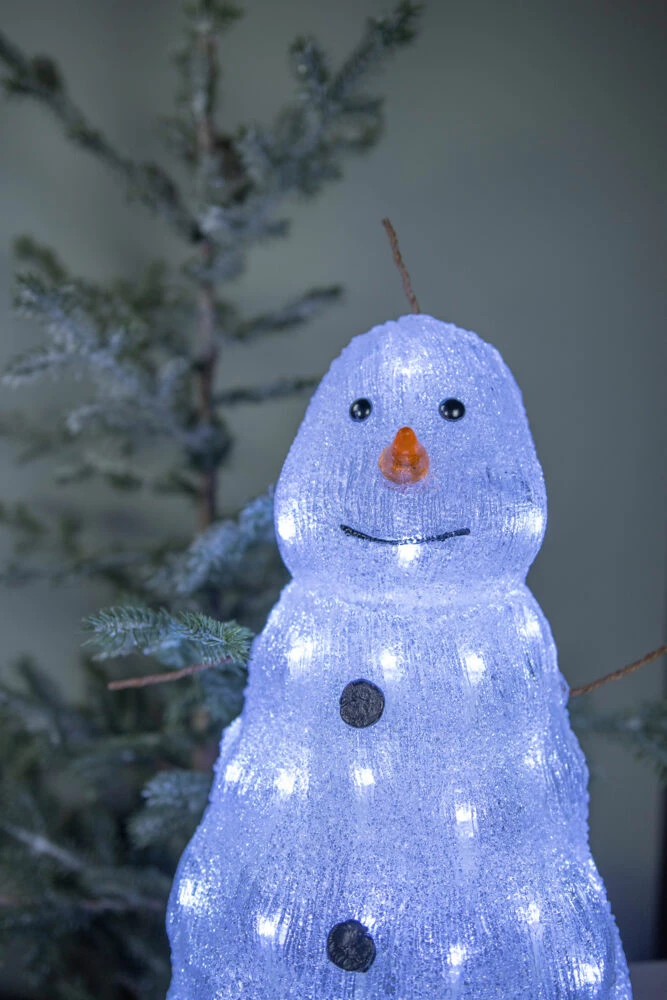 Akryl snømann med 48 varmhvite LEDlys i størrelse: 33x32x46cm. 5m transparent ledekabel. IP44 for utendørsbruk