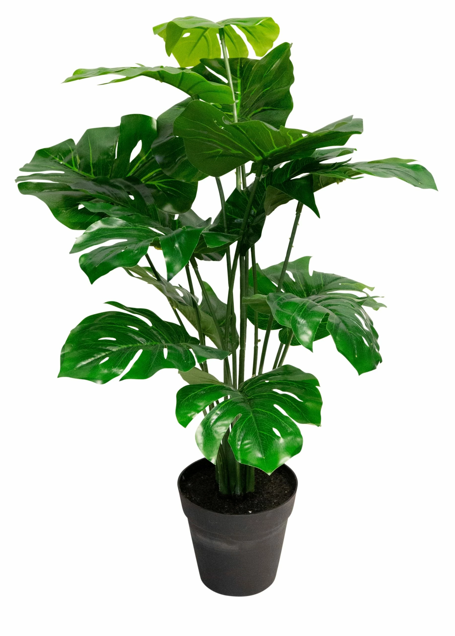 Monsteraplanten har store, flotte grønne blader og er meget dekorativ. Planten er kunstig, men har et naturtro utseende.