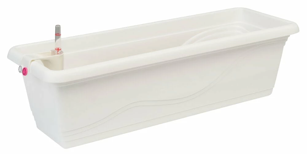 En solid balkongkasse i plast som primært er til utendørs bruk. Det medfølgende selvvanningssystemet gjør at vannet magasineres opp under planteflaten slik at planten kan hente vann fra magasinet og man slipper å vanne så ofte. Vannmengdeindikator følger med. Balkongkassen kan plasseres på bord eller henges over balkongkant ved hjelp av oppheng. Kommer i fargene antrasitt og hvit, og i størrelsene (BxH) 60×17 og 80×17 cm.