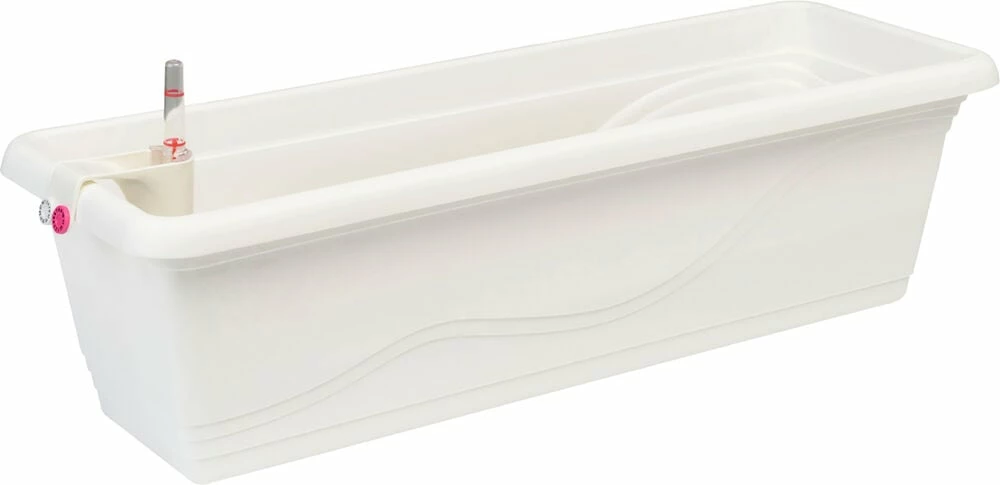 Balkongkasse i plast med bølgestruktur og medfølgende selvvanningssystem.