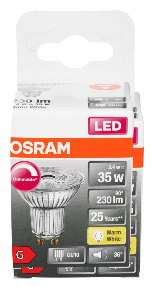 OSRAM LEDSPOT 35 3,4W GU10 DIM er en dimbar LED reflektorlamper PAR16 med GU10 sokkel.