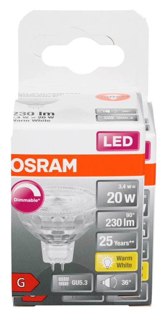 OSRAM LEDSPOT MR16 20 3,4WGU5,3D er en dimbar lavvolts LED reflektorlamper MR16 med stiftsokkel.