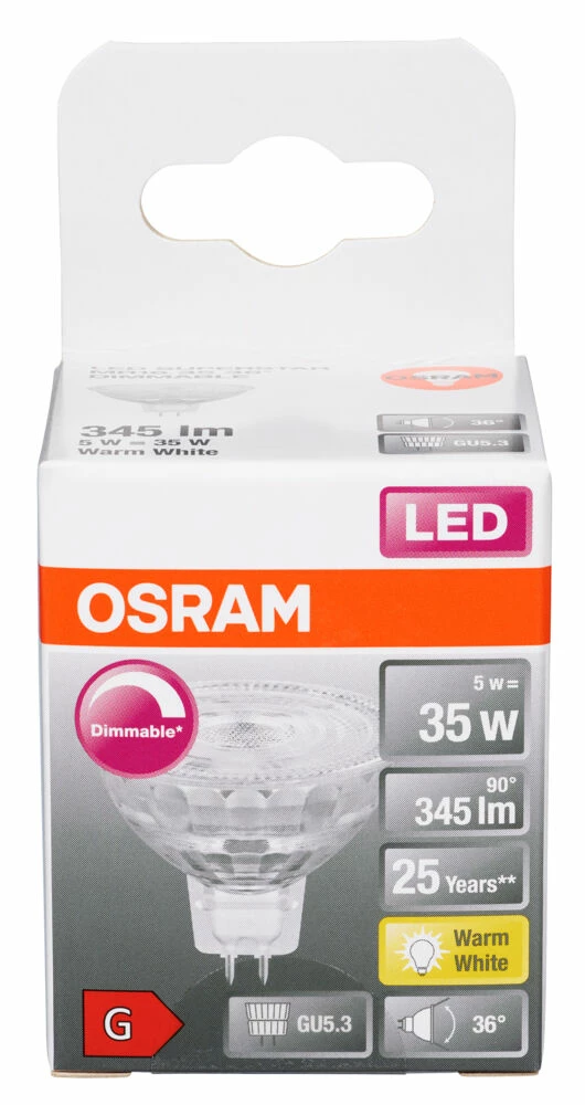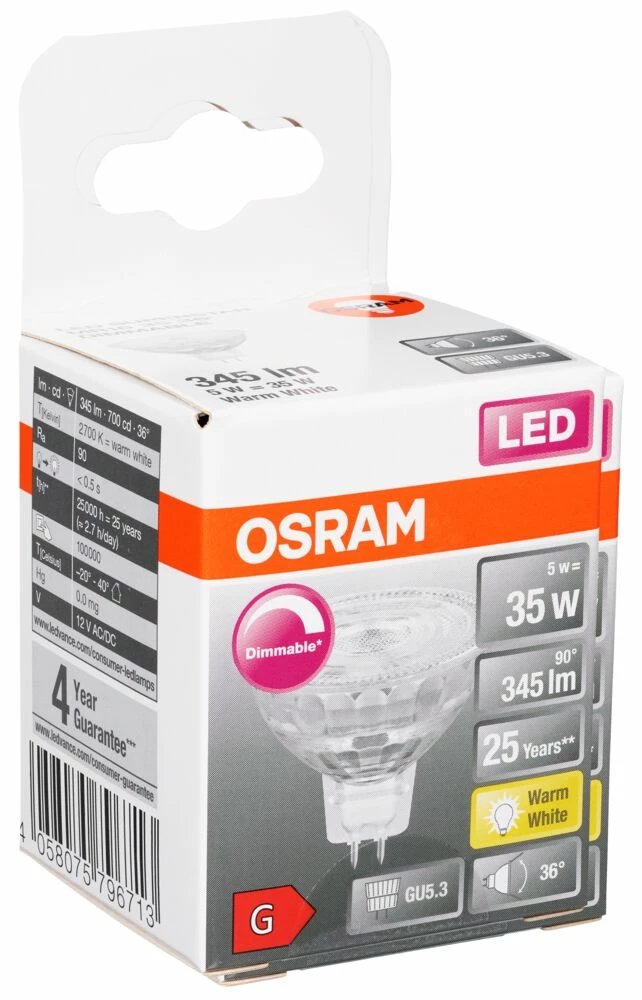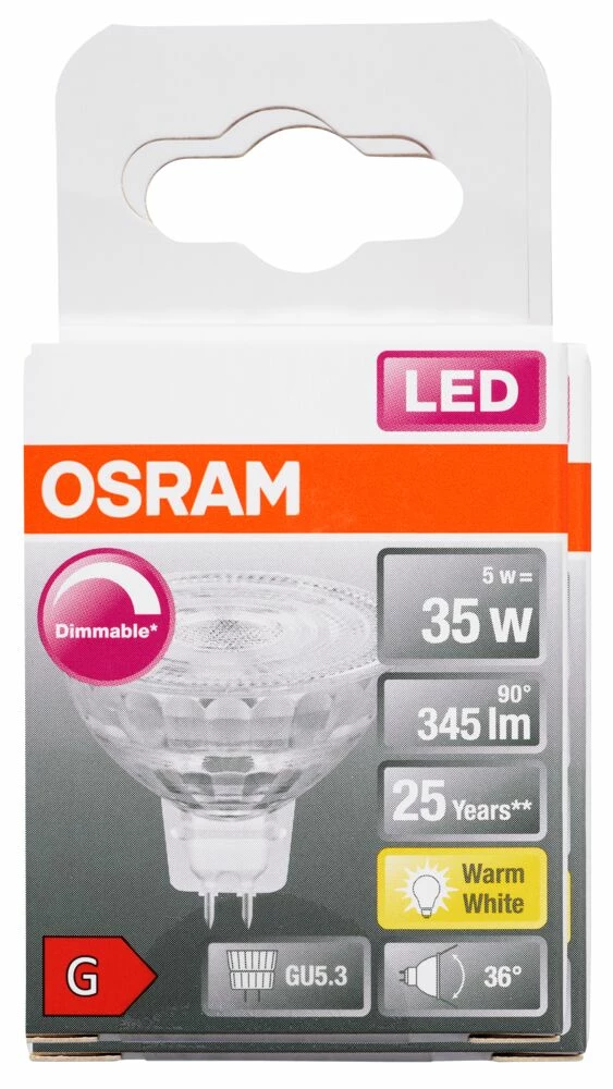 OSRAM LEDSPOT MR16 35 5WGU5,3D er en dimbar lavvolts LED reflektorlamper MR16 med stiftsokkel.