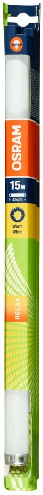 Osram Lumilux T8 15 W lysrør har et avslappende varmvhitt lys, lang levetid og god fargegjengivelse. Lysrøret har G13 sokkel. Lengde 438 mm. Lyset kan dimmes. 2700 K hvitfarge.