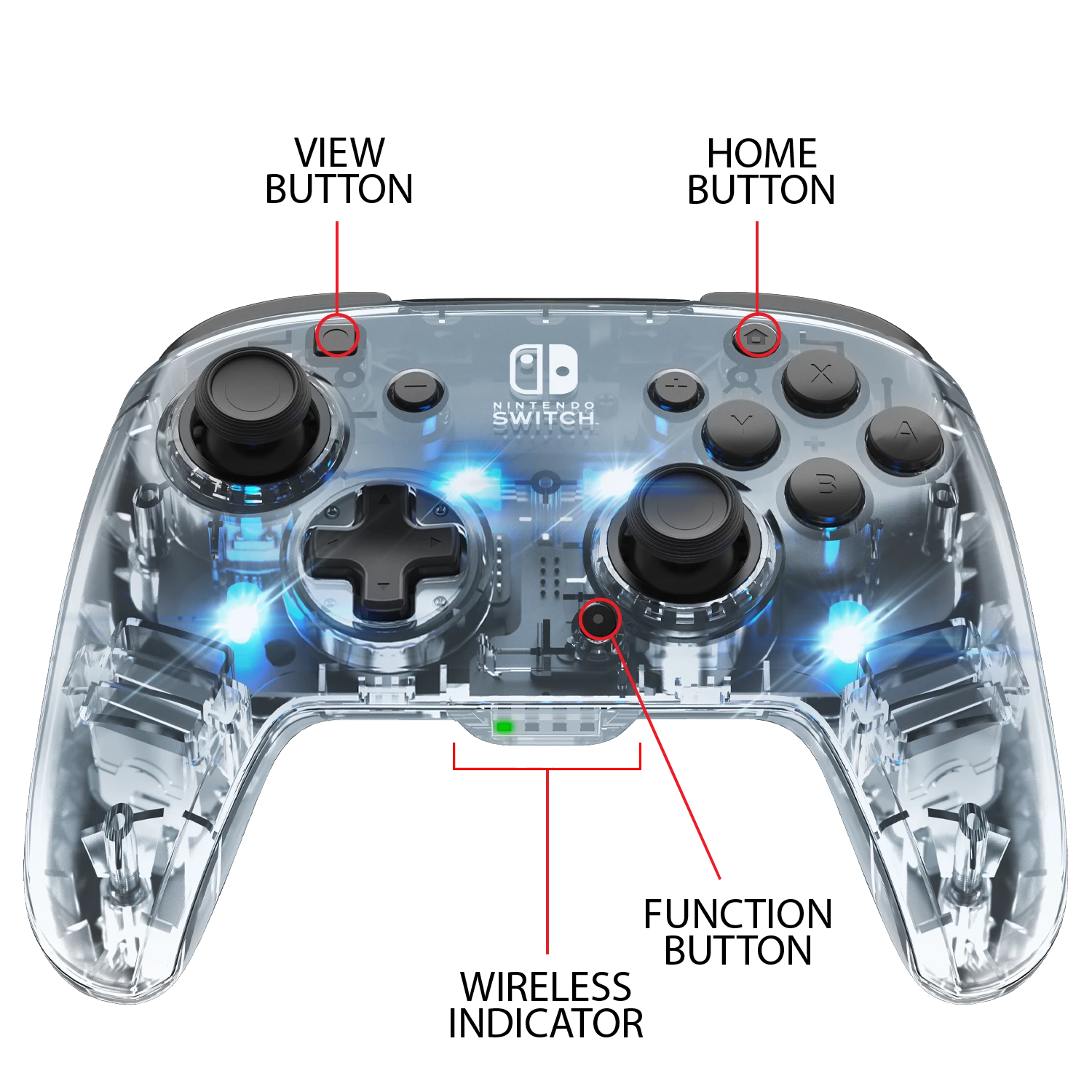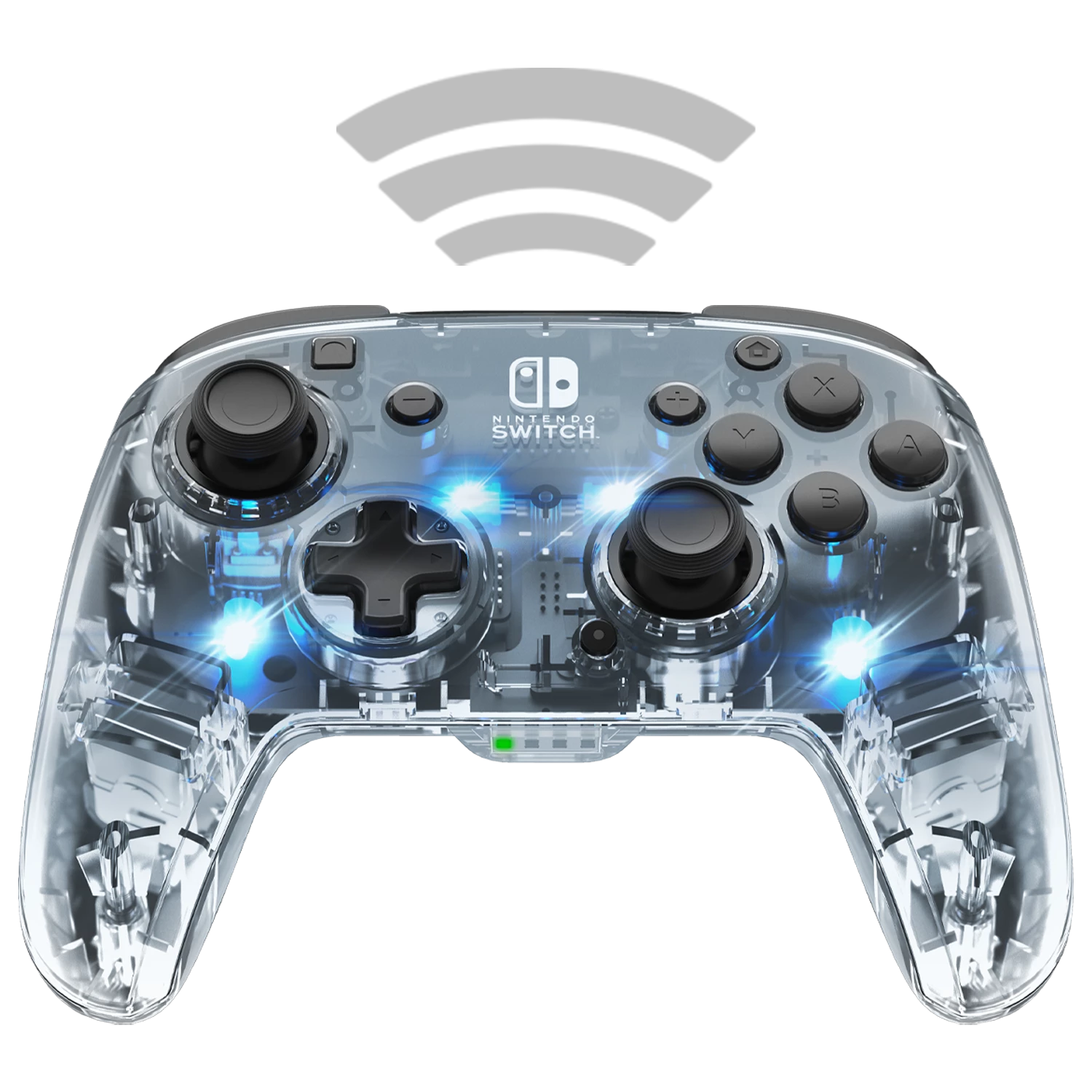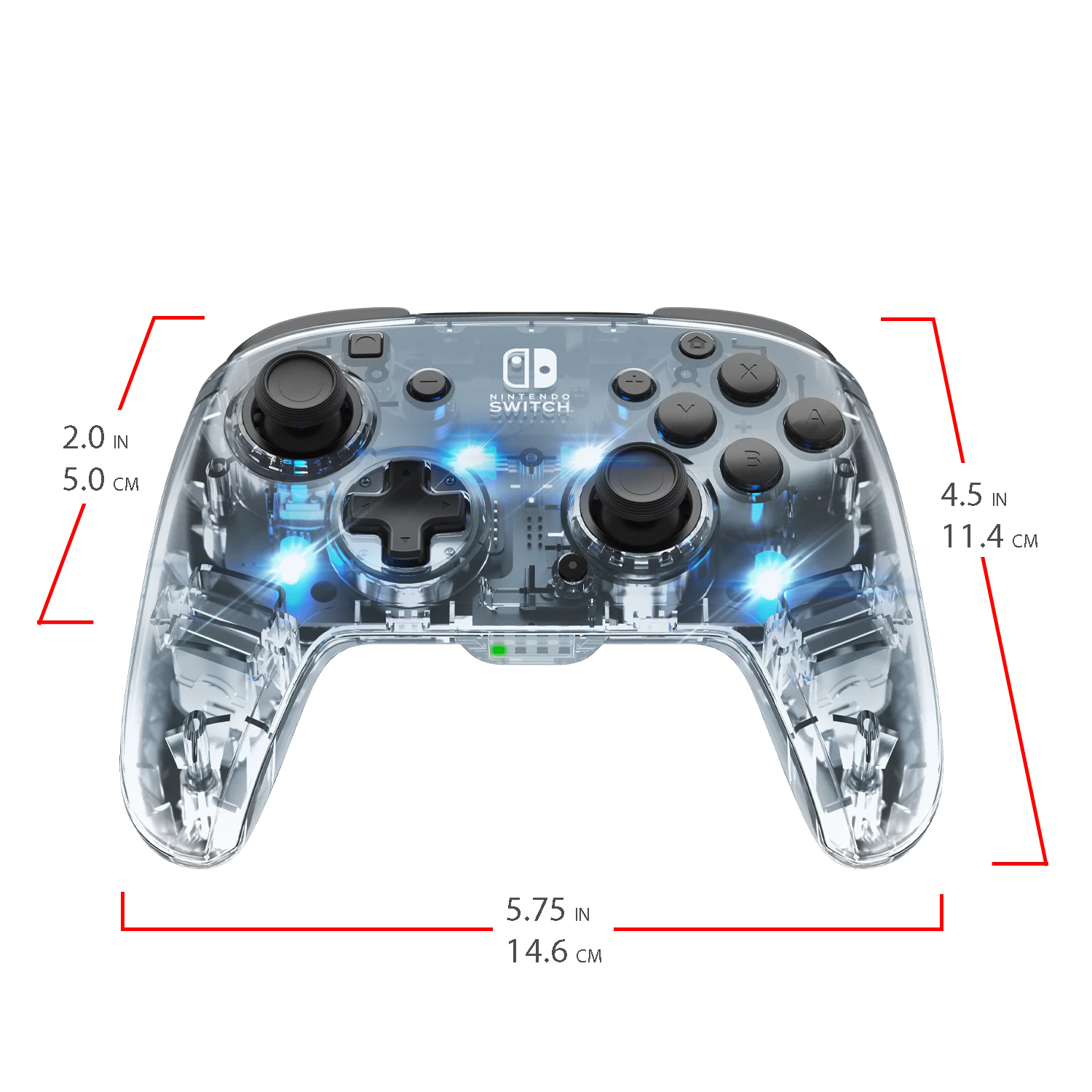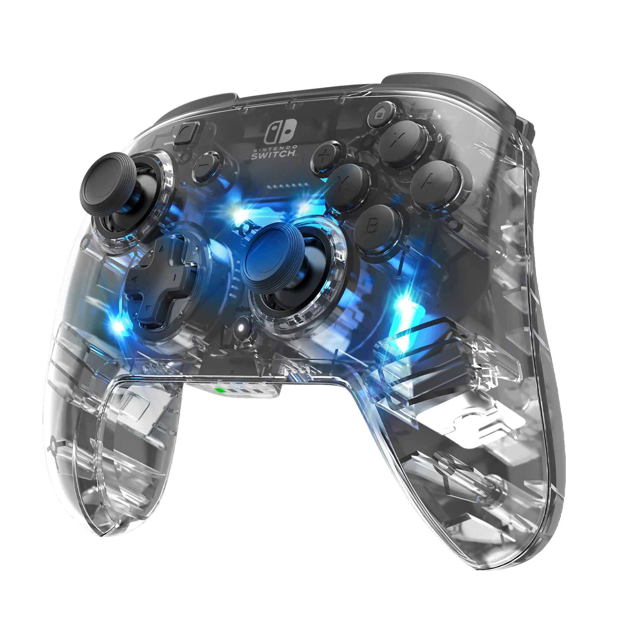 Trådløs controller til din Nintendo Switch™, med LED-belysning. Dimbart LED-lys i all regnbuens farger,- velg din favoritt eller slå lyset helt av. Transparent polykarbonat plast-hus viser all innmaten i controlleren din. USB ladekabel medfølger. Innebygd oppladbart batteri, gir opptil 20 timer spilletid. Offisielt lisensiert av Nintendo.