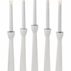Hvit adventsstake i treverk med 5 lys. Staken har 5 sølvfargede mansjetter. 6 stk. E10 pærer følger med produktet, inkludert 1 stk. reservepære. Det er 1,5 meter hvit ledning med av/på bryter. Mål adventsstake er 36x8x47 cm.