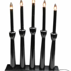 Sort adventsstake i treverk med 5 lys. Staken har 5 sølvfargede mansjetter. 6 stk. E10 pærer følger med produktet, inkludert 1 stk. reservepære. Det er 1,5 meter sort ledning med av/på bryter. Mål adventsstake er 36x8x47 cm.