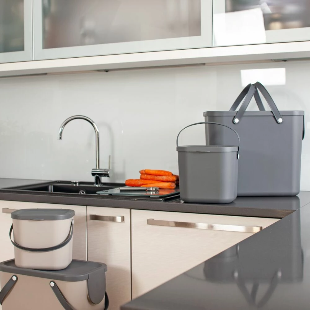Kilde og søppelsortering skal være enkelt og lettvint. Disse oppbevaringsbøttene er tilrettelagt for god og praktisk kildesortering med lokk som hindrer vond lukt, godt håndtak som gjør bøtten enkel å bære. Diskre farger. Enkel å plassere enten på kjøkkenet, vaskerommet eller på balkongen. De kan stables. Tre str.LxBxH: 40l (40×35,8×34 cm) 25l (40x34x23,5 cm) og 6l (23,5×20,8×20 cm)