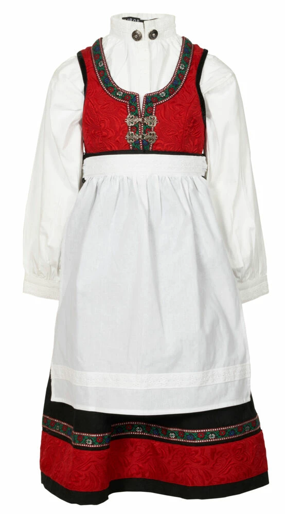 Nydelig festdrakt i utmerket kvalitet. Lekkert jaquard vevet liv og nydelig kantebånd nederst. Komplett sett med drakt og skjorte. Forkle selges separat.