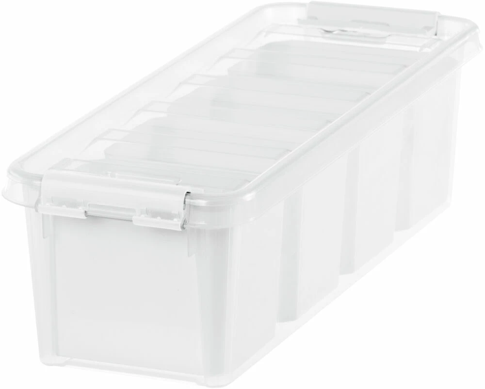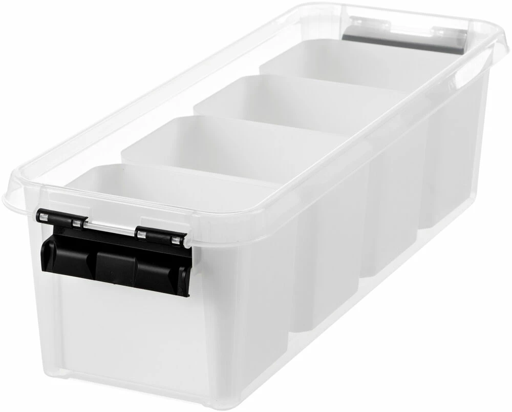 Praktisk og avlang oppbevaringsboks inkludert innsatser. Optimal for optimal for oppbevaring av alle typer små artikler som for eksempel kosmetikk, stearinlys, penner, børster, verktøy, kontorartikler etc. Flere bokser kan stables oppe på hverandre. Kraftige klips holder lokket på plass. Godkjent for oppbevaring av mat.
