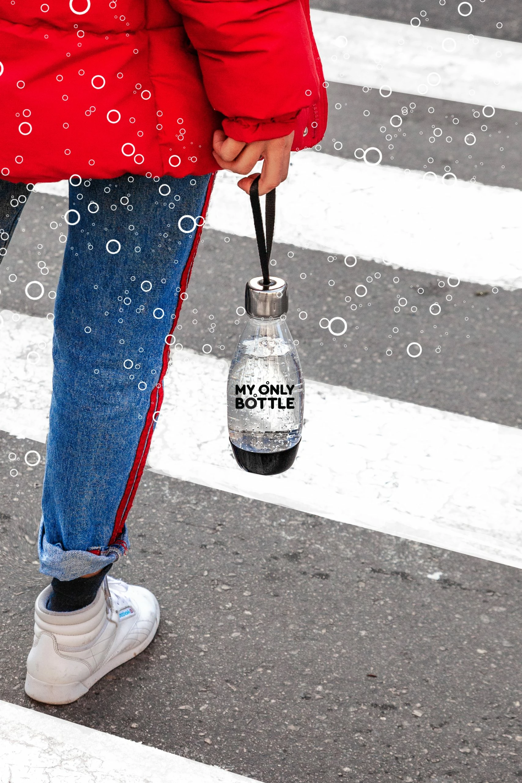 FUSE gjenbruksflaske «My Only Bottle» er nå tilgjengelig i materiale som tåler oppvaskmaskin, har metallhette og bærebøyle – en perfekt på-farten-flaske for din favorittdrikke med eller uten bobler. SodaStream flasker er BPA-frie og er ikke laget av polykarbonatmaterialer eller stoffer som produserer ftalater eller PCB. Passer til alle SodaStream-maskiner (unntatt Crystal).