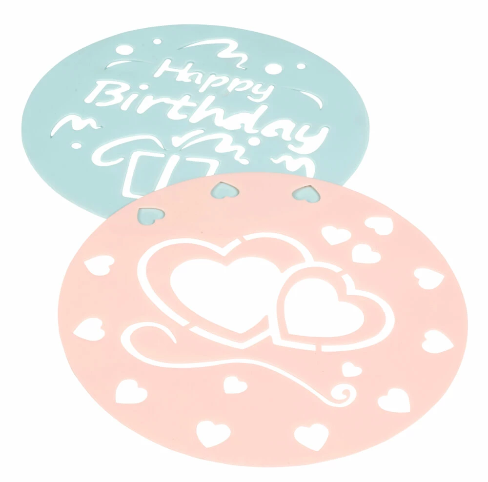 Dekoreringsstensiler for å dekorere kake. Med mønster Happy Birthday, og Hjerte.