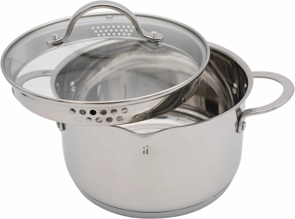 SPiiS® gryte med lokk. Gryten er produsert i rustfritt stål, med helle tut. Glasslokk med sil. Kan rengjøres i oppvaskmaskin og passer til alle koketopper.