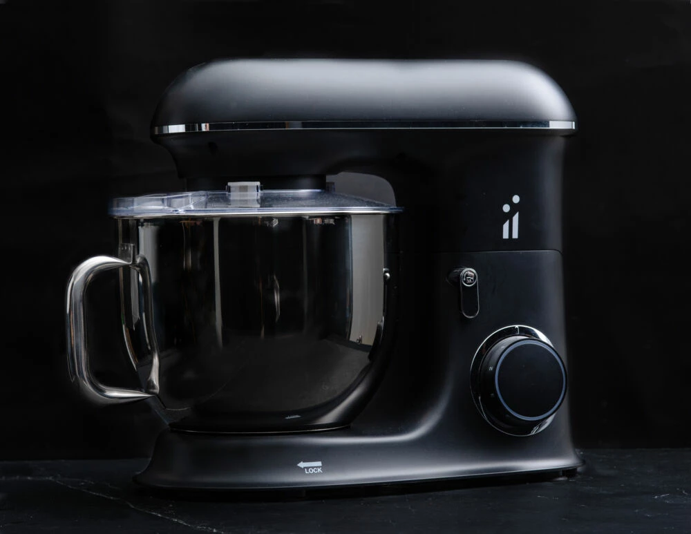 Kjøkkenmaskinen kommer i en flott matt sort utførelse med detaljer og dekor i sølv.