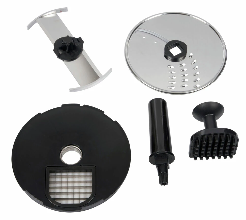 Det følger med en praktisk kutteskive som kan brukes til poteter, gulrøtter, agurk og lignende. Raspeskiven er godt egnet til ost, gulrøtter, potet, agurk og mye annet. Kubekutteren er egnet til å kutte rå og kokte grønnsaker og frukt i små terninger.